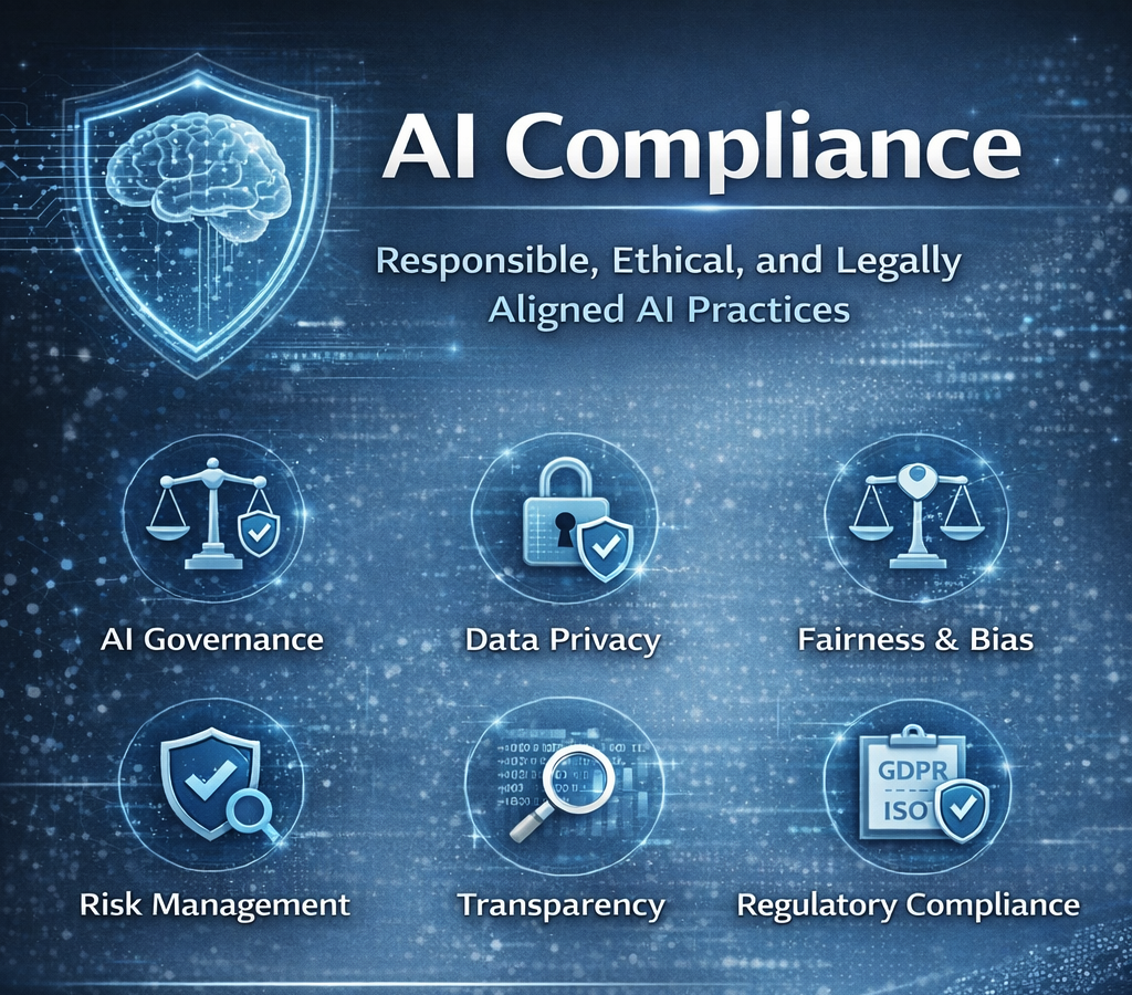 AI Compliance ensures that artificial intelligence systems are developed and used in a responsible, ethical and legally aligned manner. Our compliance framework helps organizations follow data protection laws, industry standards and ethical guidelines while using AI technologies. We focus on transparency, fairness, privacy protection and risk management to build trustworthy AI solutions that are safe for users and businesses.